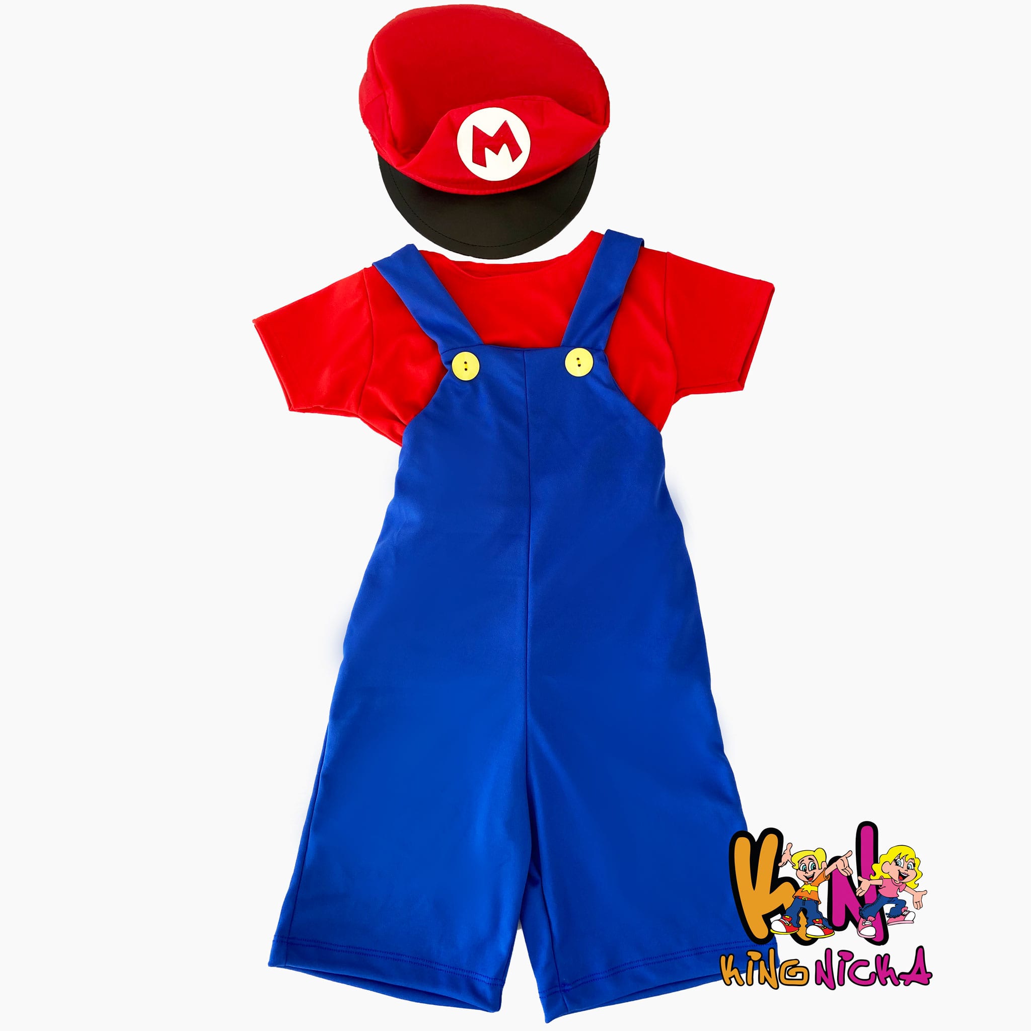 Camiseta de manga curta e macacão de helanca (com elasticidade) e chapéu.