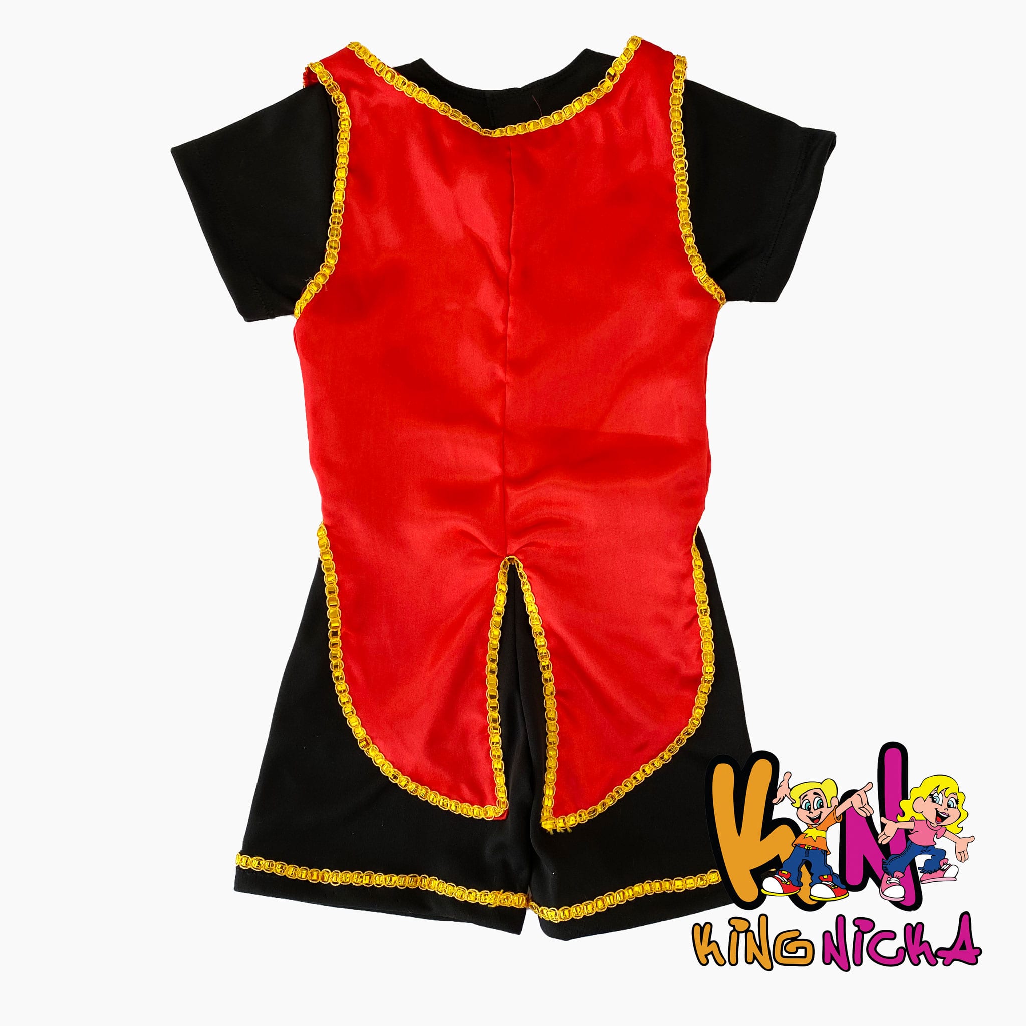 Macacão com manga curta de helanca com detalhes em dourado (com elasticidade) e colete vermelho com detalhes em dourado e gravatinha (cetim) e chapéu.